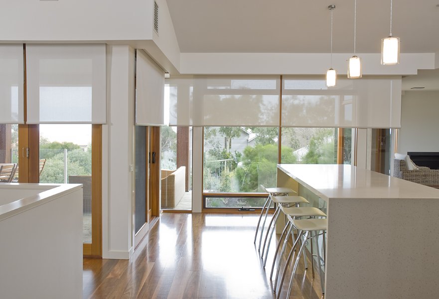Roller Shades Sun Screen: This shade is the ultimate all-rounder for the sun-filled spaces in your home. During peak sunshine hours, this shade will filter sun rays and cut glare to comfortably light your space. Light is allowed in, but the shade keeps up to 80% of UV rays from penetrating through your window and damaging your floors and furniture. All this happens, while still providing you a view of the outdoors through the shade. This is best suited for kitchens, dining rooms, and living/family rooms.