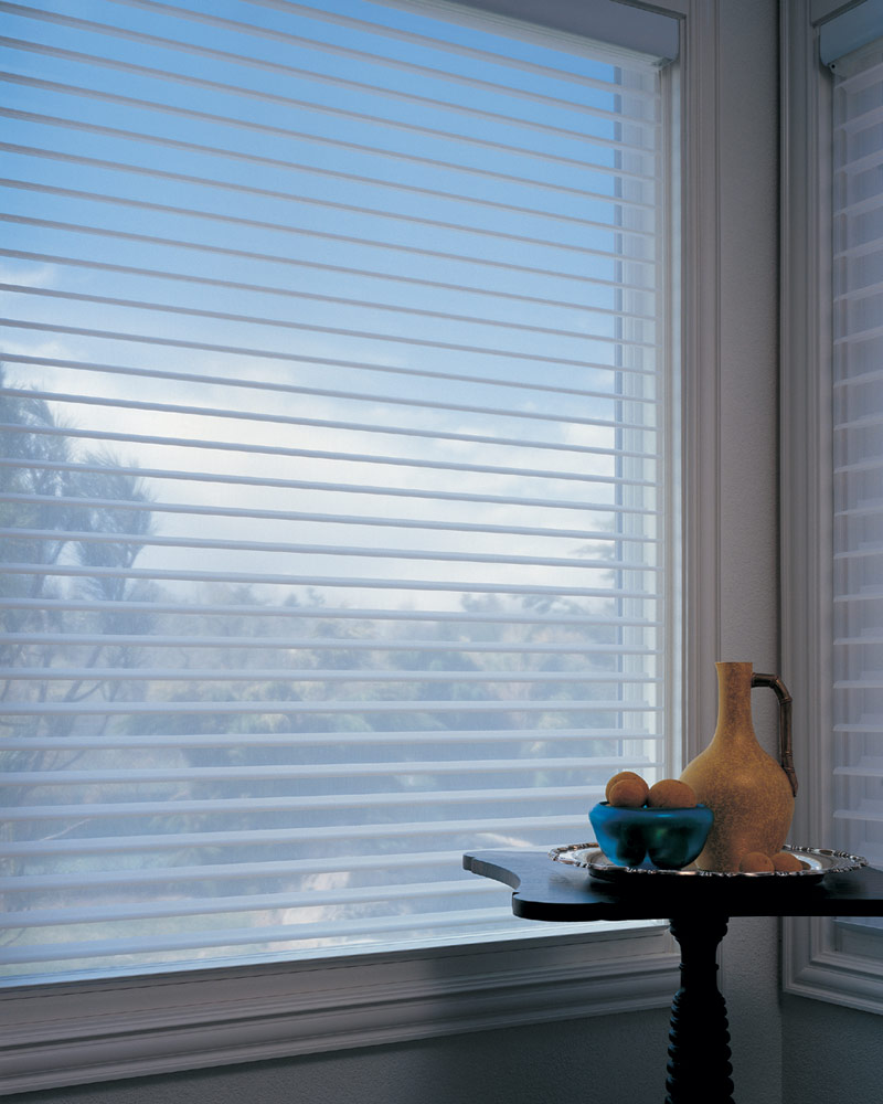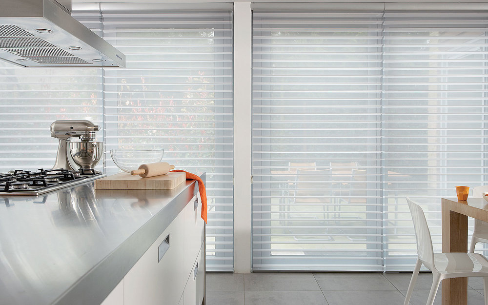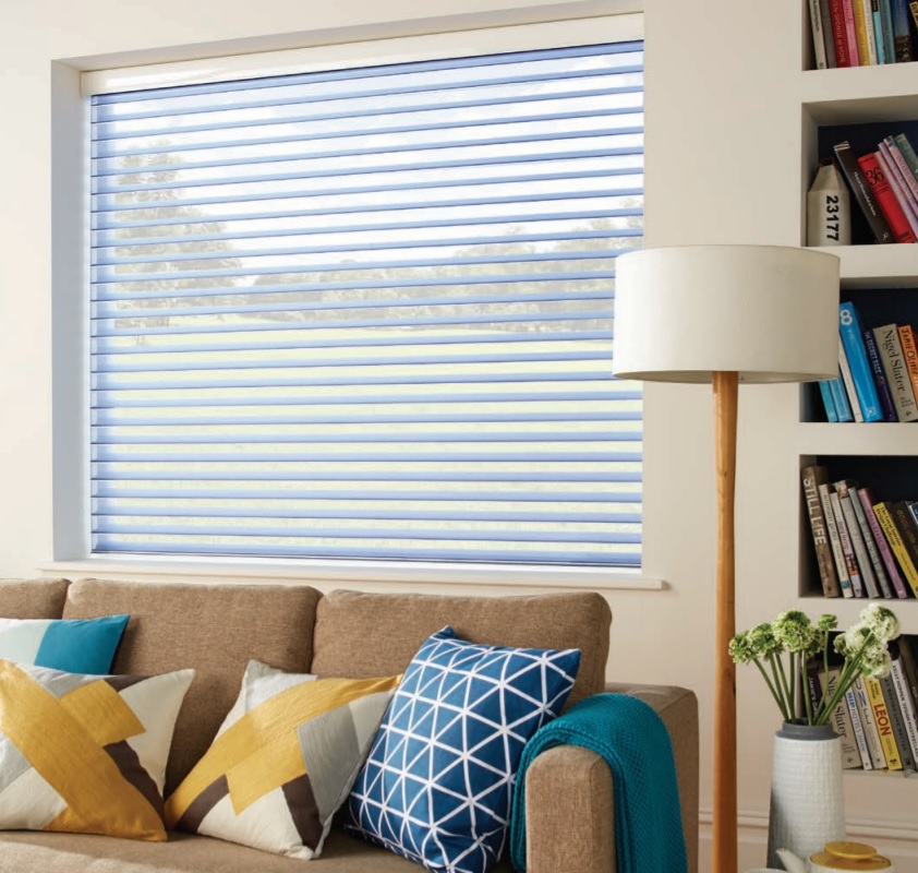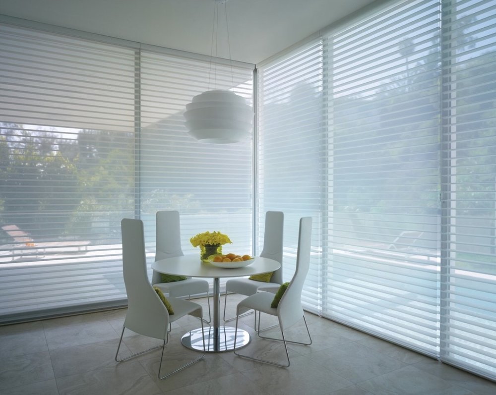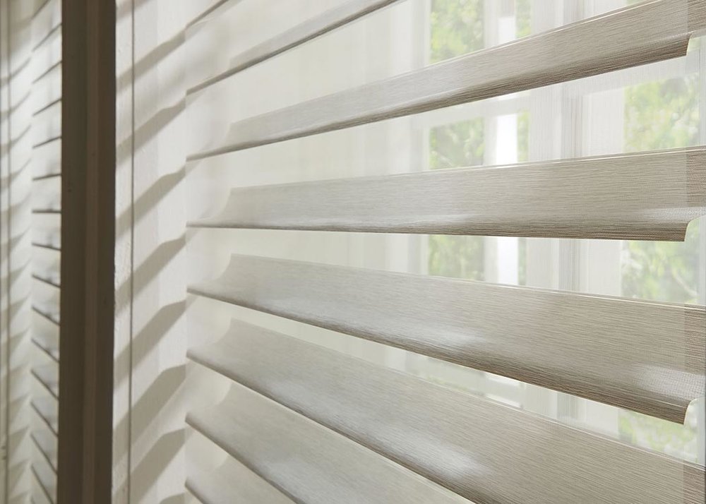 Solar Cell is multiple, soft, adjustable s-shaped vanes that appear to be floating between two sheer fabrics that you can adjust your privacy and light control by tilting the veins to your desired position. The veins are available in sheer or black out material. When no privacy or light control is required, this blind can be rolled up all the way into a curve cassette.